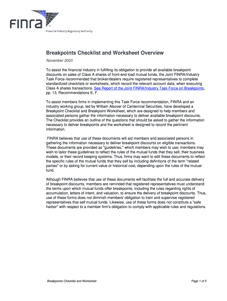 Get the free Breakpoints Checklist and Worksheetdoc - finra
