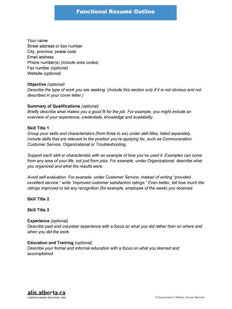 Functional Resume Outline Your name Street address or box number City, province, postal code Email address Phone number(s) (include area codes) Fax number (optional) Website (optional) Objective (optional)