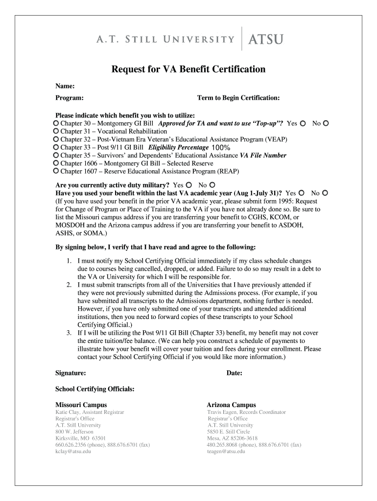 Get the free Request for VA Benefit Certification - AT Still University - atsu