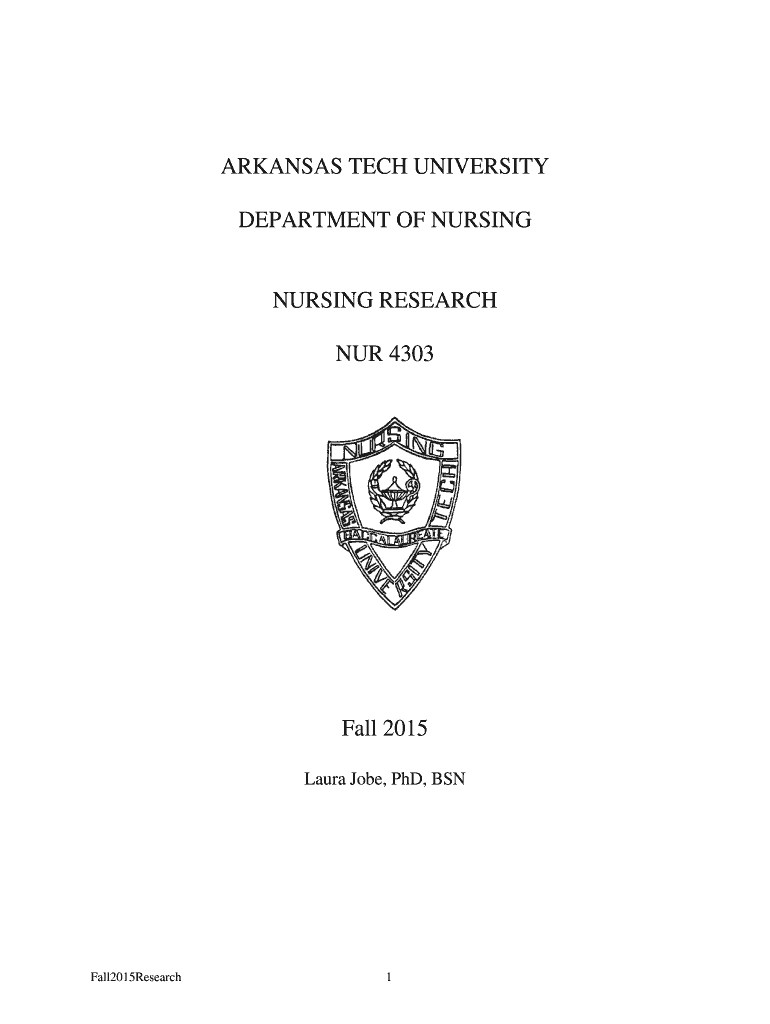 ARKANSAS TECH UNIVERSITY DEPARTMENT OF NURSING RESEARCH OUR 4303 Fall 2015 Laura Job, PhD, BSN Fall2015Research 1 INDEX Topic Page Course Description 4 Instructional Resources.....................................................................................................