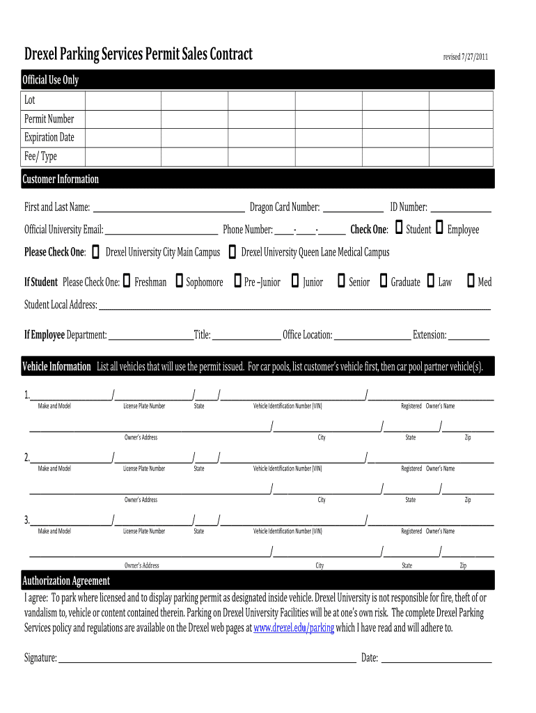 Drexel Parking Services Permit Sales Contract revised 7/27/2011 Official Use Only Lot Permit Number Expiration Date Fee/ Type Customer Information First and Last Name: Dragon Card Number: ID Number:
