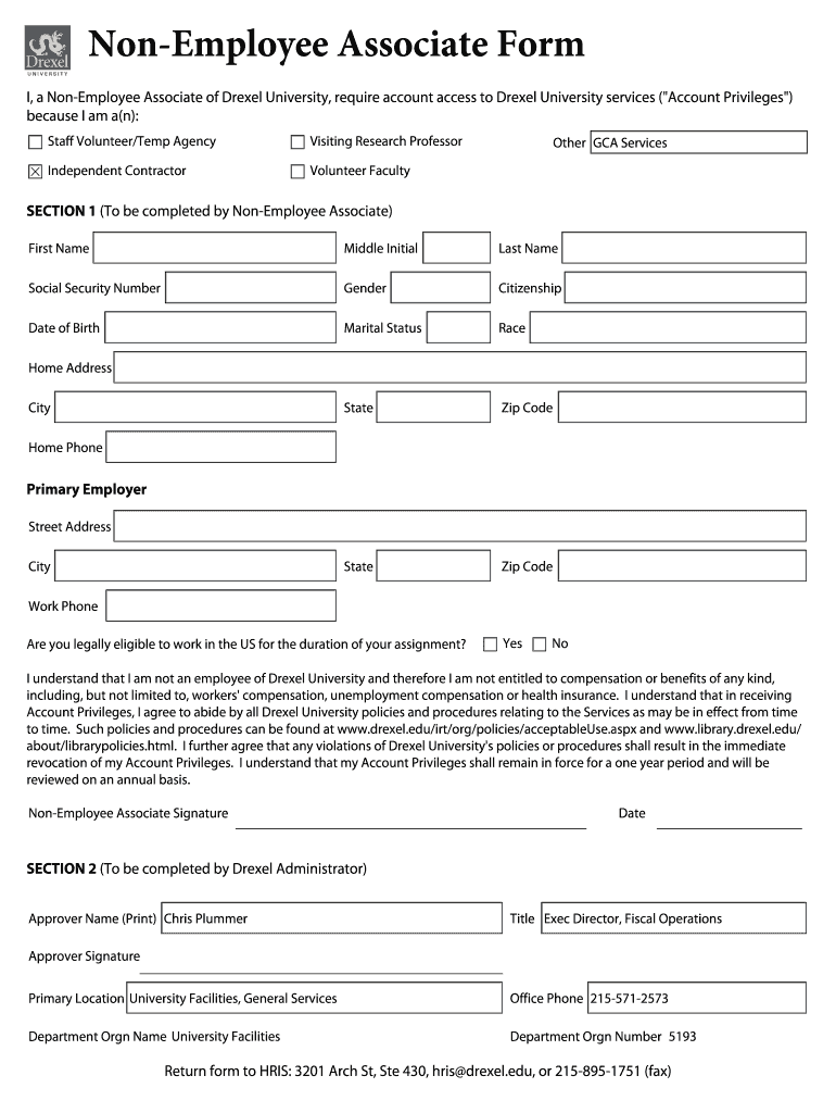 Employee Associate Form I, an Employee Associate of Drexel University, require account access to Drexel University services (“Account Privileges “) because I am a(n): Staff Volunteer/Temp Agency