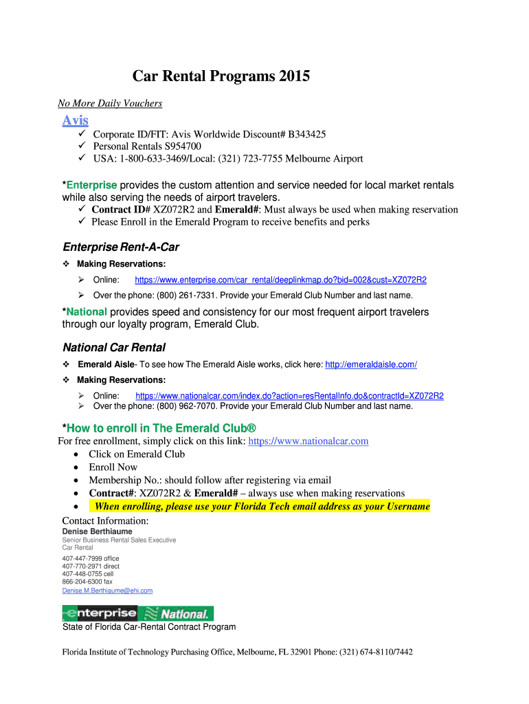 Car Rental Programs 2015 No More Daily Vouchers Avis Corporate ID/FIT: Avis Worldwide Discount# B343425 Personal Rentals S954700 USA: 18006333469/Local: (321) 7237755 Melbourne Airport *Enterprise