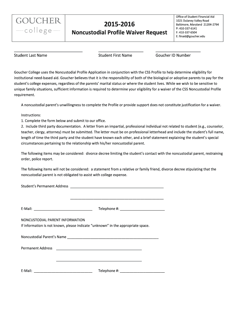 PRINT 20152016 Noncustodial Profile Waiver Request Student Last Name Student First Name RESET Office of Student Financial Aid 1021 Delaney Valley Road Baltimore, Maryland 212042794 P: 4103376141 F: