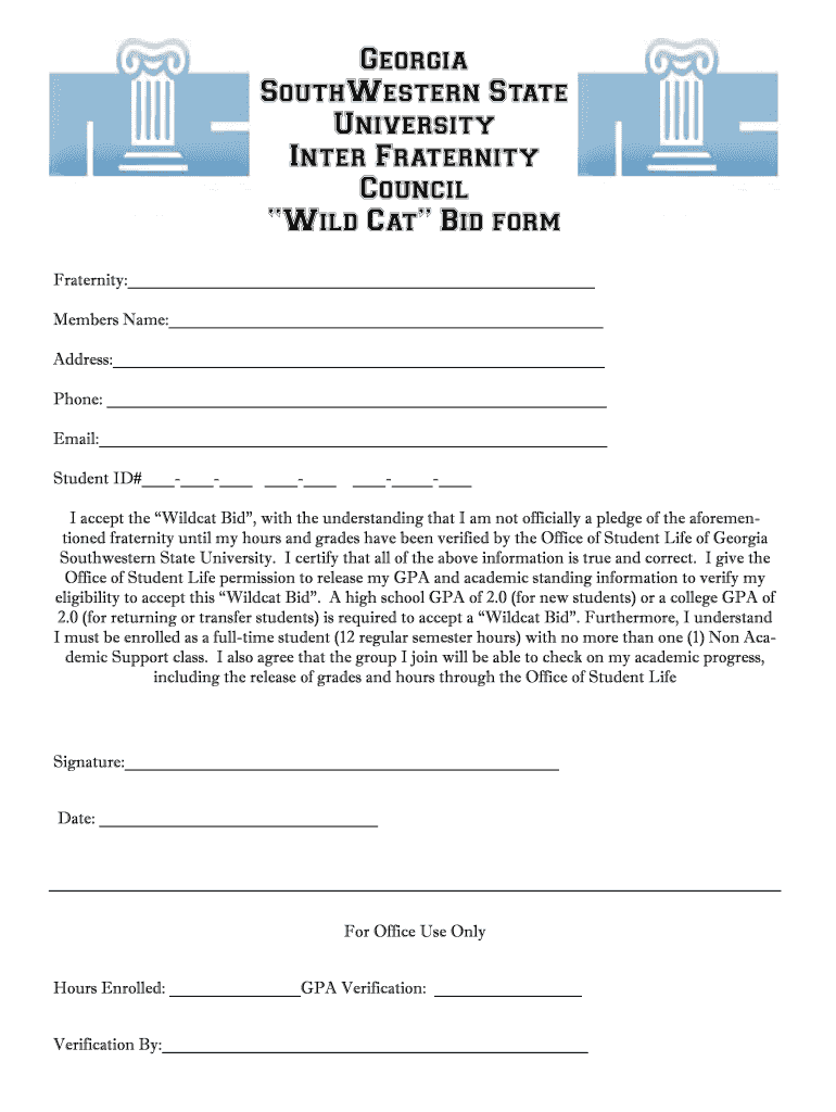Georgia Southwestern State University Inter Fraternity Council Wild Cat Bid form Fraternity: Members Name: Address: Phone: Email: Student ID# I accept the Wildcat Bid, with the understanding that