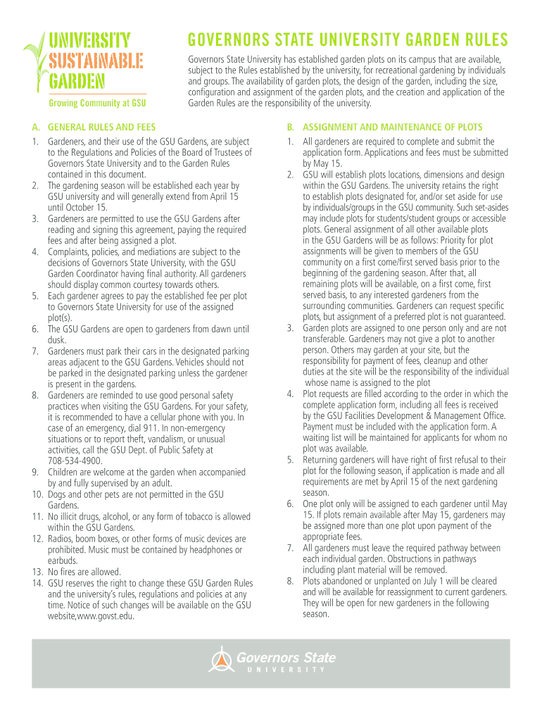 University sustainable garden Growing Community at CSU GOVERNORS STATE UNIVERSITY GARDEN RULES Governors State University has established garden plots on its campus that are available, subject to