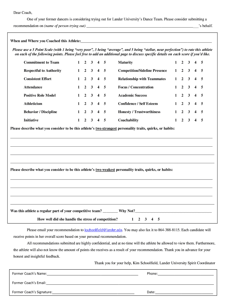 Dear Coach, One of your former dancers is considering trying out for Lander Universities Dance Team. Please consider submitting a recommendation on (name of person trying out) s behalf. When and Where