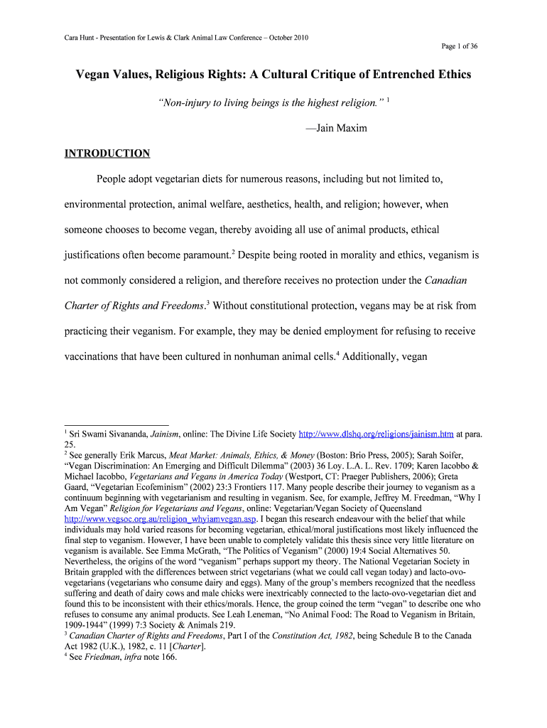 Cara Hunt Presentation for Lewis & Clark Animal Law Conference October 2010-Page 1 of 36Vegan Values, Religious Rights: A Cultural Critique of Entrenched Ethics Noninjury to living beings is the highest