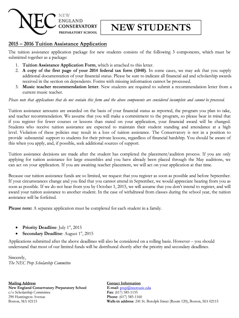 NEW STUDENTS 2015 2016 Tuition Assistance Application The tuition assistance application package for new students consists of the following 3 components, which must be submitted together as a package:
