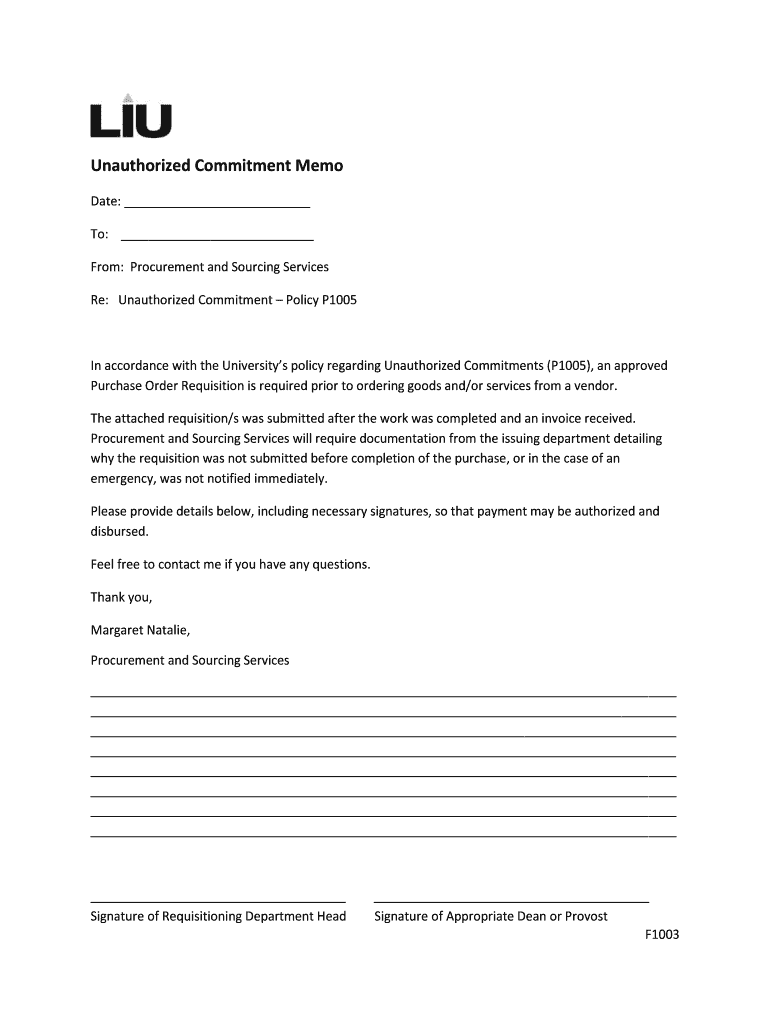 Unauthorized Commitment Memo Date: To: From: Procurement and Sourcing Services Re: Unauthorized Commitment Policy P1005 In accordance with the Universities' policy regarding Unauthorized Commitments