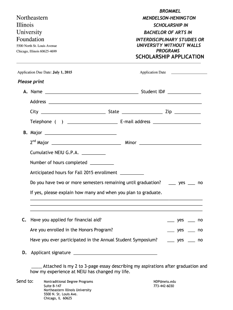 ROMMEL MENDELSONHENINGTON Northeastern Illinois University Foundation SCHOLARSHIP IN BACHELOR OF ARTS IN INTERDISCIPLINARY STUDIES OR UNIVERSITY WITHOUT WALLS PROGRAMS 5500 North St. Louis Avenue