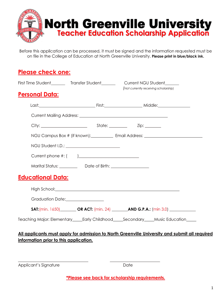Teacher Education Scholarship Application Before this application can be processed, it must be signed and the information requested must be on file in the College of Education at North Greenville