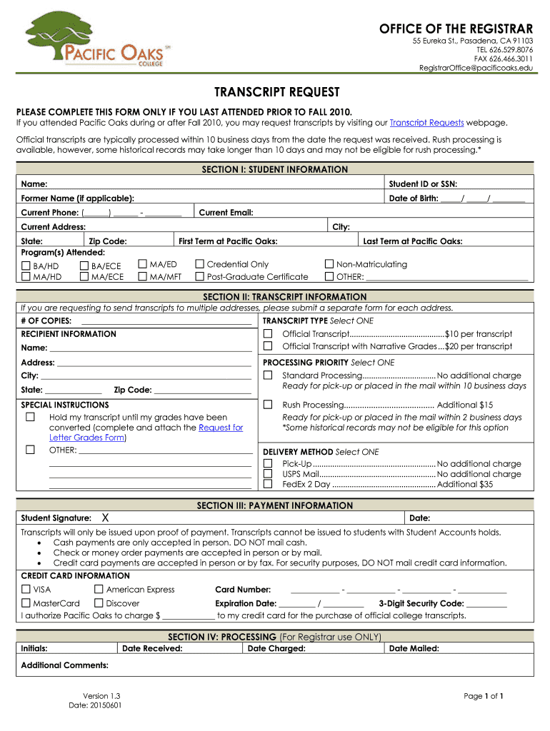 OFFICE OF THE REGISTRAR 55 Eureka St., Pasadena, CA 91103 TEL 626.529.8076 FAX 626.466.3011 RegistrarOffice pacific oaks.edu TRANSCRIPT REQUEST PLEASE COMPLETE THIS FORM ONLY IF YOU LAST ATTENDED