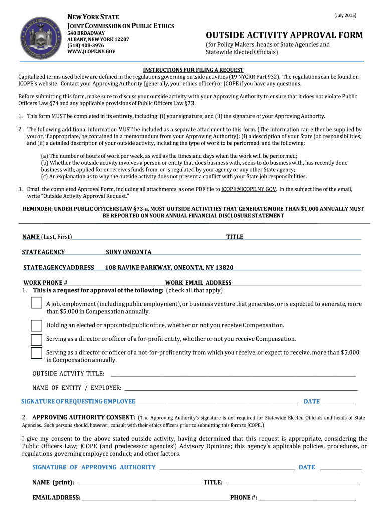 NEW YORK STATE JOINT COMMISSION ON PUBLIC ETHICS 540 BROADWAY ALBANY, NEW YORK 12207 (518) 408-3976 WWW.SCOPE.NY.GOV (July 2015) OUTSIDE ACTIVITY APPROVAL FORM (for policymakers, heads of State Agencies