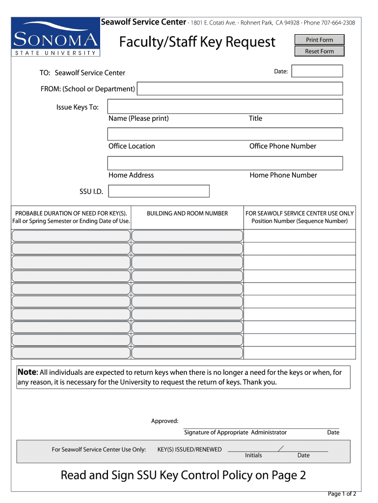 Get the free Seawolf Service Center FacultyStaff Key Request - sonoma