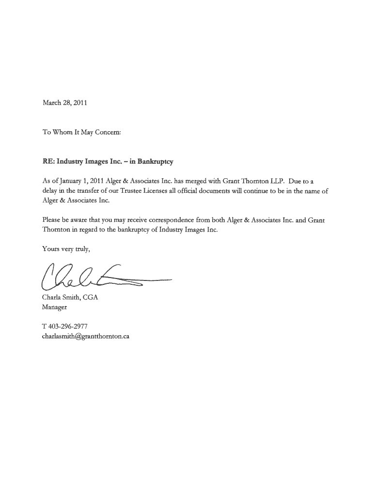 400, 602 11 Avenue SW Calgary, Alberta T2R 1J8 T 403 2985800 F 403 2962988 www.alger.ca Proof Of Claim In the matter of the bankruptcy (or proposal or receivership of the property) of: Industry Images
