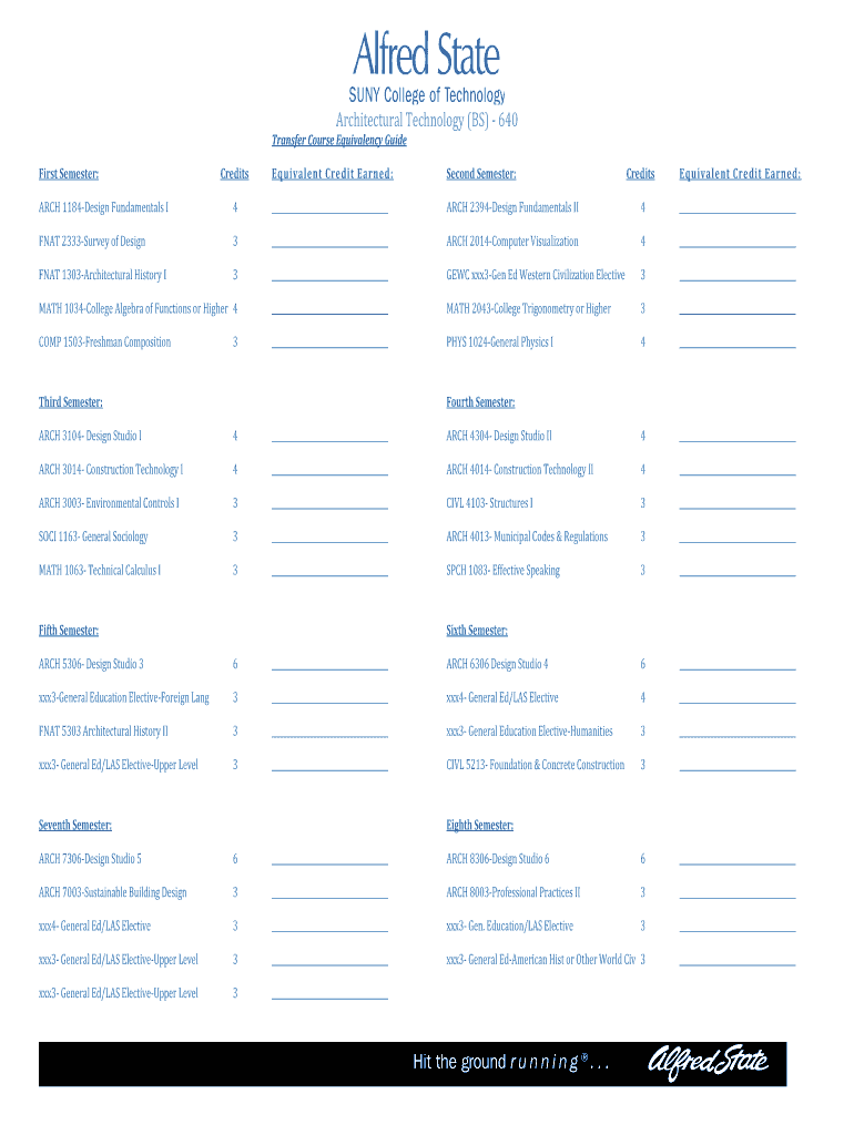 Architectural Technology (BS) 640 Transfer Course Equivalency Guide First Semester: Credits Equivalent Credit Earned: Second Semester: Credits ARCH 1184Design Fundamentals I 4 ARCH 2394Design Fundamentals