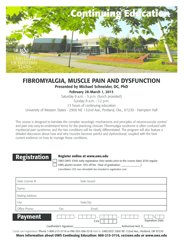 Continuing Education University of Western States FIBROMYALGIA, MUSCLE PAIN AND DYSFUNCTION Presented by Michael Schneider, DC, PhD February 28March 1, 2015 Saturday 9 a.m. 5 p.m. (lunch provided)