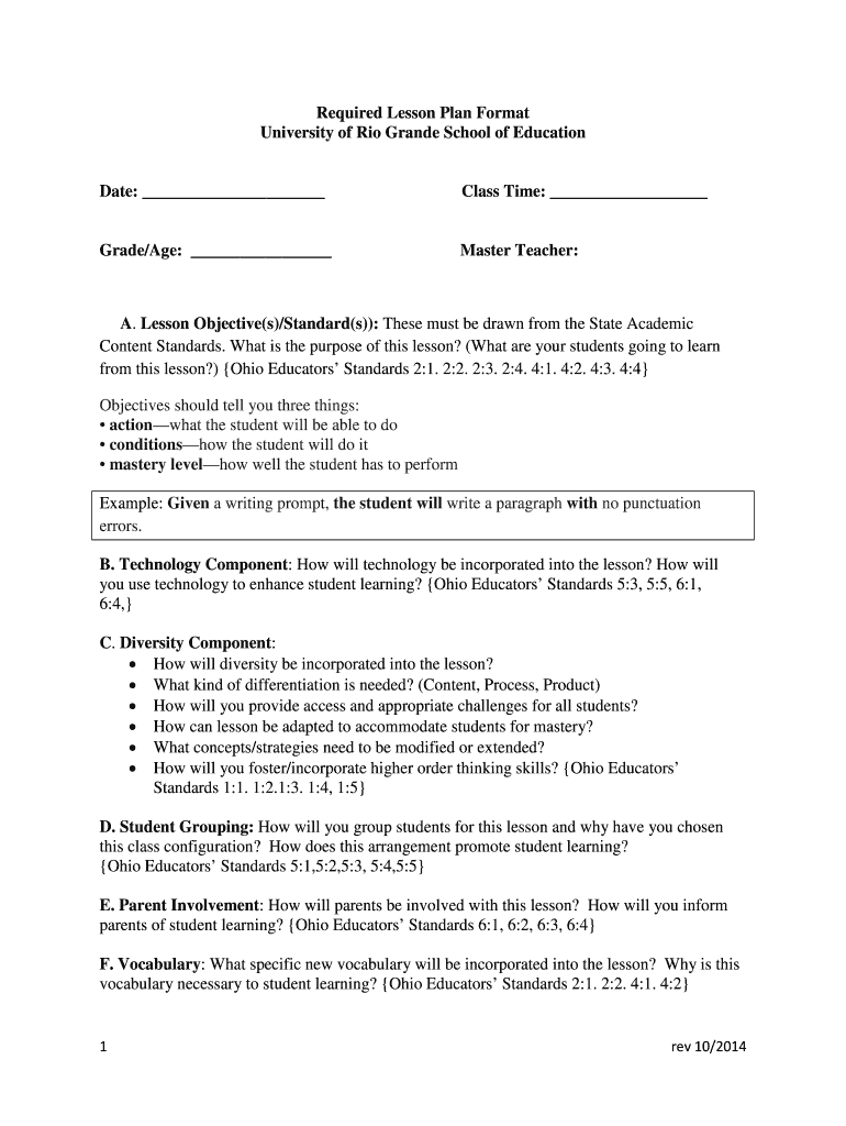 Required Lesson Plan Format University of Rio Grande School of Education Date: Class Time: Grade/Age: Master Teacher: A. Lesson Objective(s)/Standard(s)): These must be drawn from the State Academic