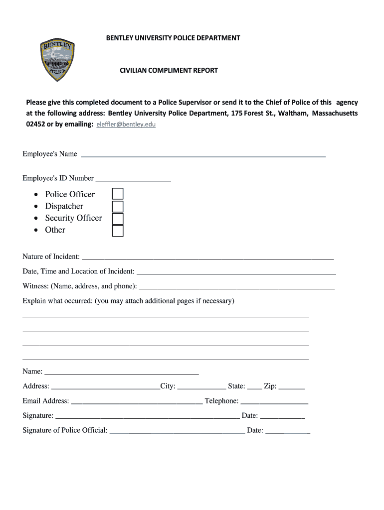 Get the free BUPD Compliment FormFILLABLE - bentley
