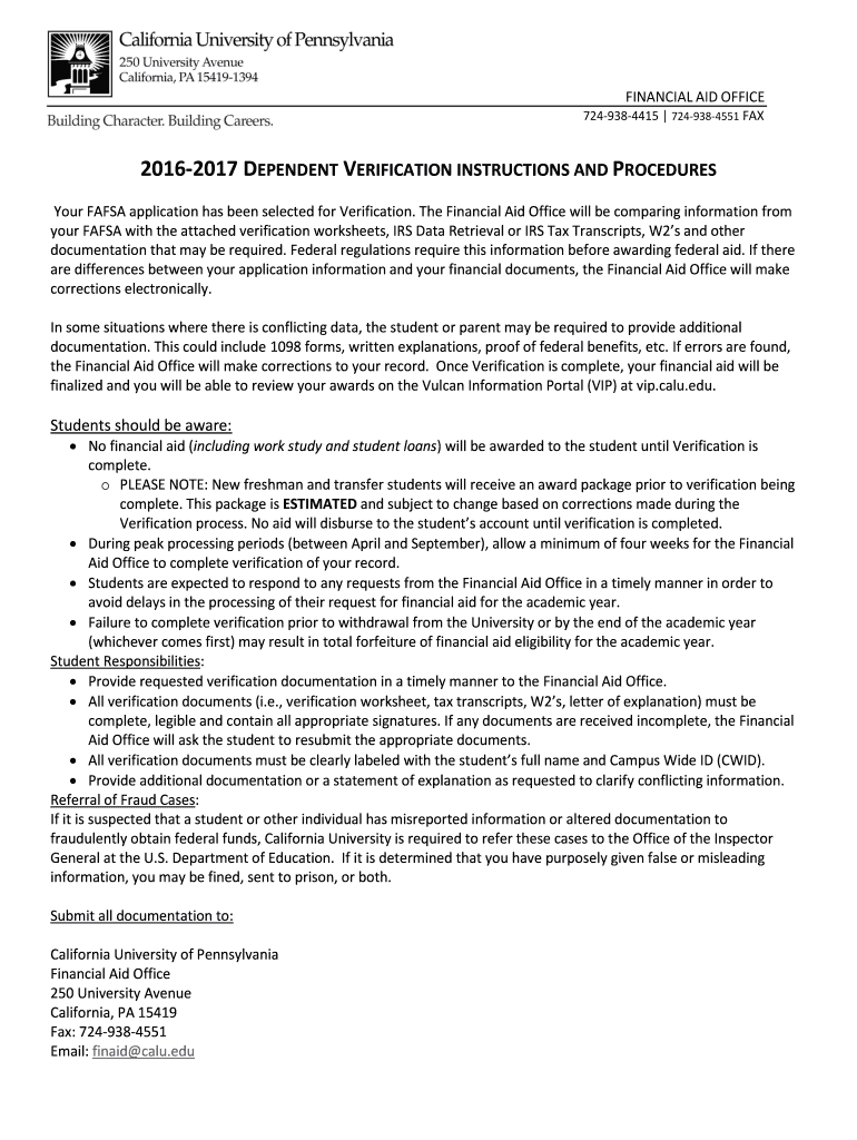 FINANCIAL AID OFFICE 724-938-4415 724-938-4551 FAX 2016-2017 DEPENDENT VERIFICATION INSTRUCTIONS AND PROCEDURES Your FAFSA application has been selected for Verification. The Financial Aid Office