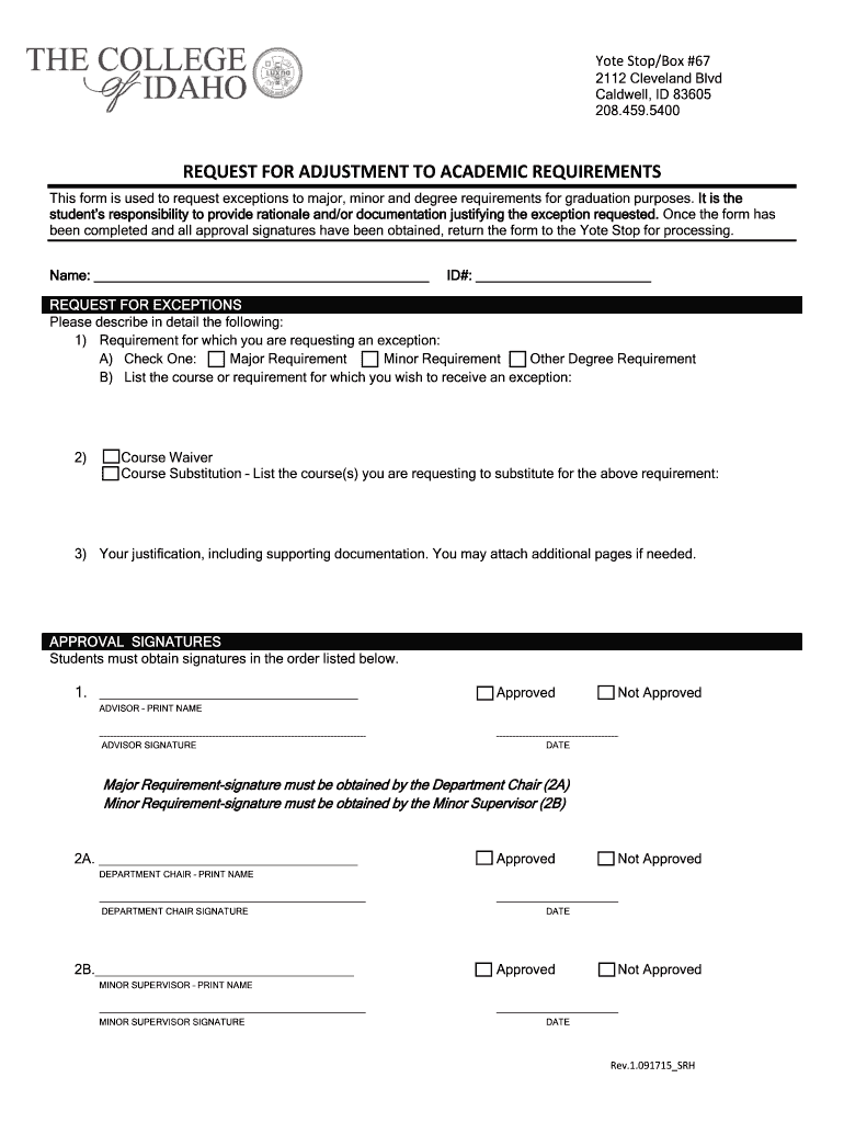 Vote Stop/Box #67 2112 Cleveland Blvd Caldwell, ID 83605 208.459.5400 REQUEST FOR ADJUSTMENT TO ACADEMIC REQUIREMENTS This form is used to request exceptions to major, minor and degree requirements