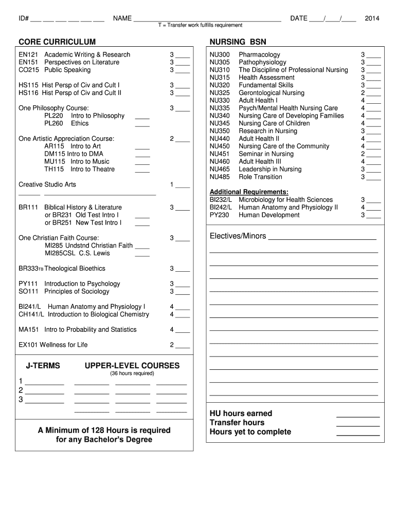 ID# NAME DATE / / 2014 T Transfer work fulfills requirement CORE CURRICULUM NURSING BSN EN121 Academic Writing & Research EN151 Perspectives on Literature CO215 Public Speaking 3 3 3 HS115 Hist PERP