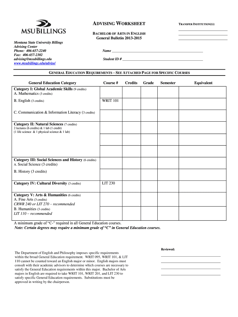 ADVISING WORKSHEET TRANSFER INSTITUTION(S): BACHELOR OF ARTS IN ENGLISH General Bulletin 20132015 Montana State University Billings Advising Center Phone: 4066572240 Fax: 4066572302 advising shillings.edu