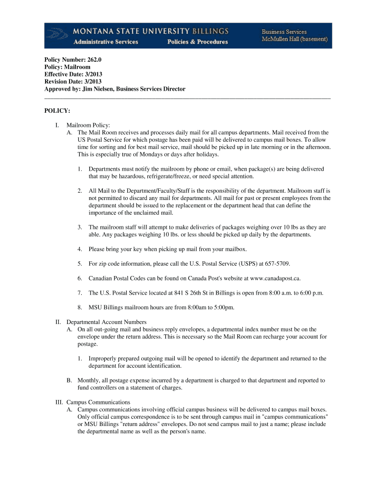 Policy Number: 262.0 Policy: Mailroom Effective Date: 3/2013 Revision Date: 3/2013 Approved by: Jim Nielsen, Business Services Director POLICY: I. Mailroom Policy: A. The Mail Room receives and processes
