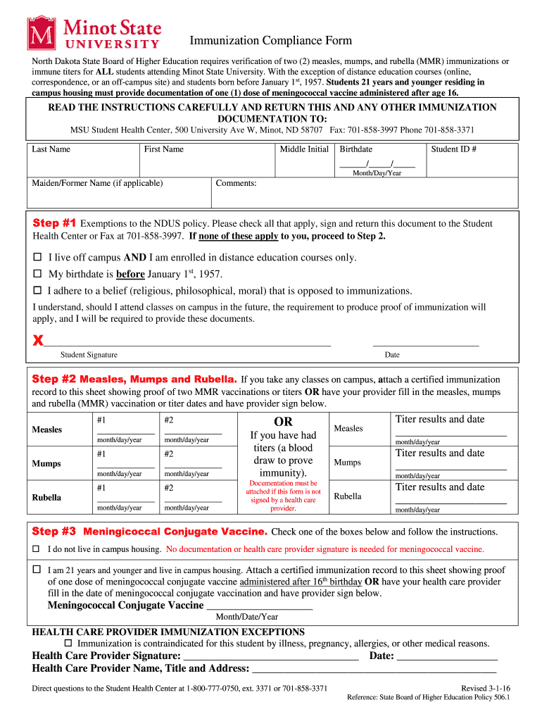 The immunization compliance form is a document that verifies that an individual has received the required vaccinations or has a valid exemption.