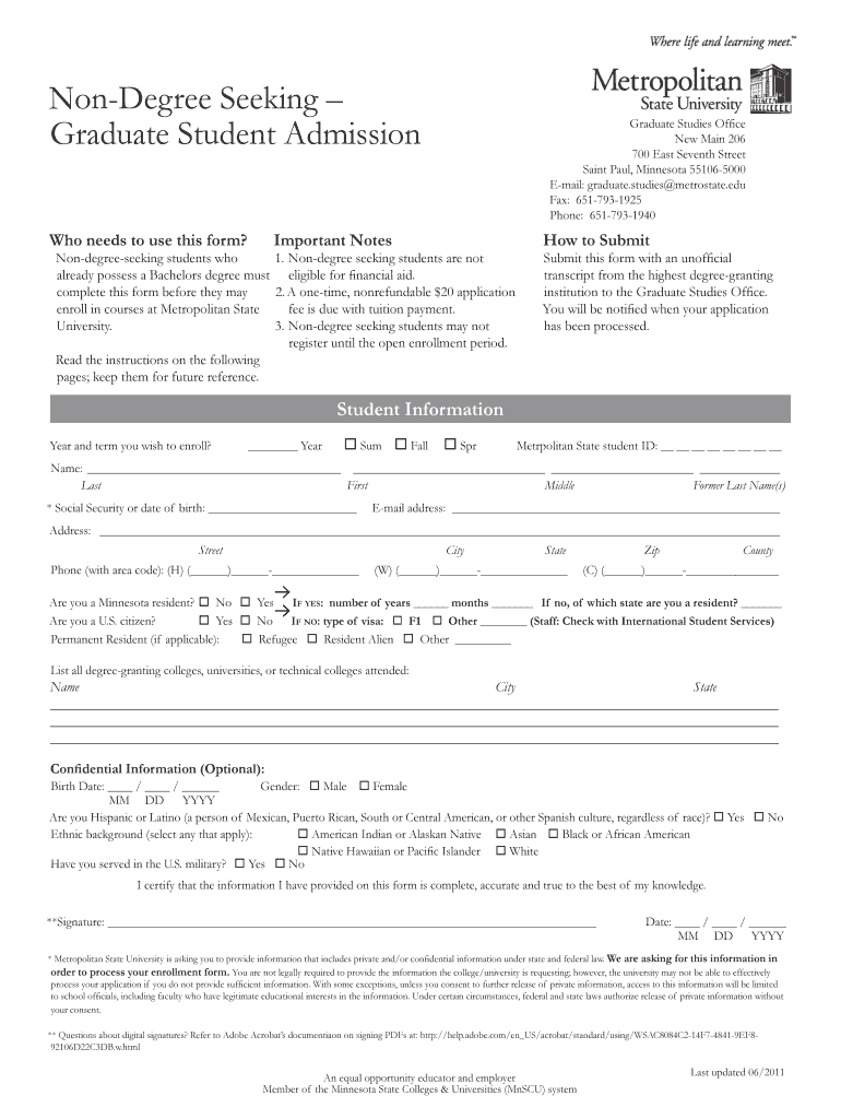 NonDegree Seeking Graduate Student Admission Who needs to use this form? Graduate Studies OFCE New Main 206 700 East Seventh Street Saint Paul, Minnesota 551065000 Email: graduate. Studies metro state.edu