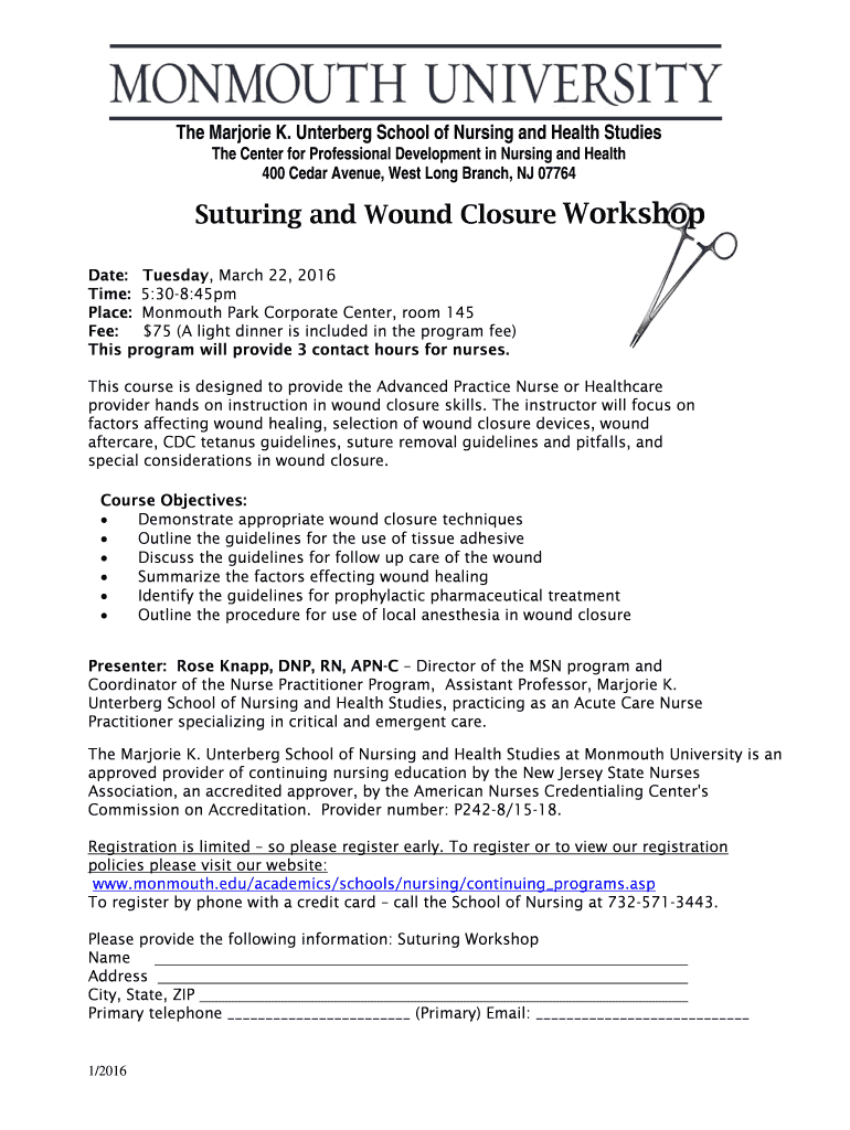 The Marjorie K. Interfere School of Nursing and Health Studies The Center for Professional Development in Nursing and Health 400 Cedar Avenue, West Long Branch, NJ 07764 Suturing and Wound Closure