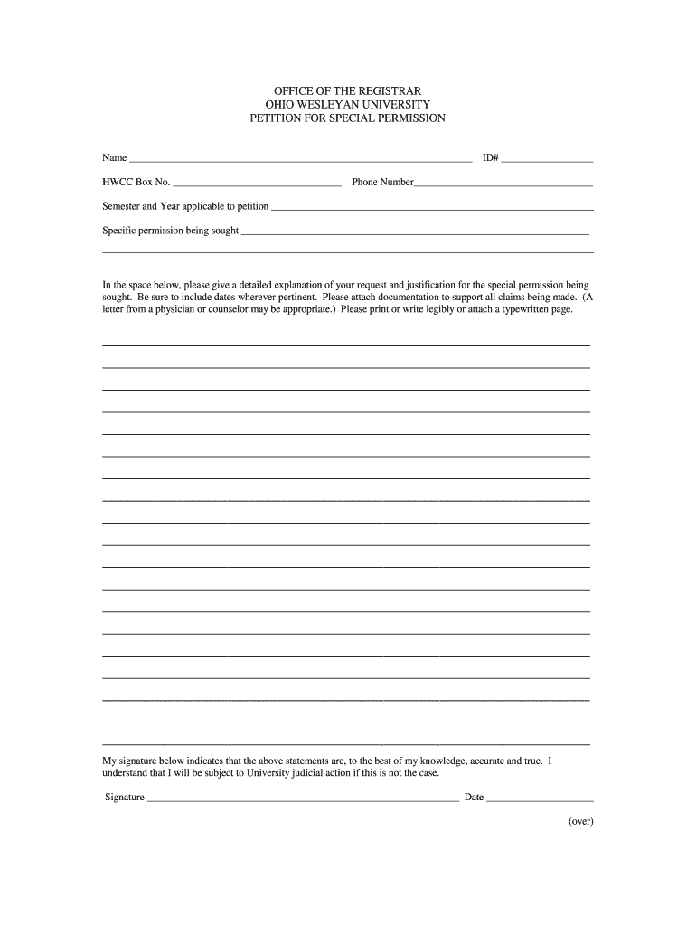 OFFICE OF THE REGISTRAR OHIO WESLEYAN UNIVERSITY PETITION FOR SPECIAL PERMISSION Name ID# HCC Box No. Phone Number Semester and Year applicable to petition Specific permission being sought In the