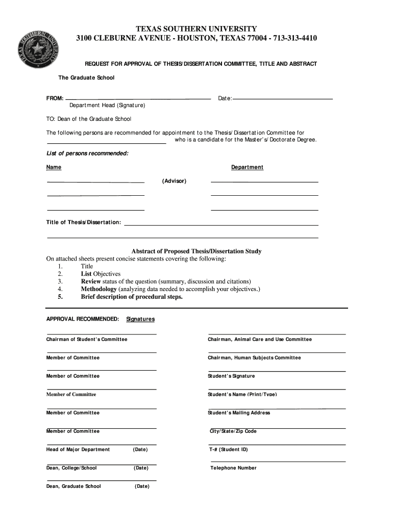 TEX WAS OUT THEN UNI DIVERSITY Y 3100 CLUB BURN EAV VENUE HO HOUSTON, T TEXAS 770 71331 004 134410 REQUEST FOR APPROVAL OF THESIS/ AL /DISSERTATION COMMITTEE, TITLE AND AB N, ABSTRACT G of The Graduate