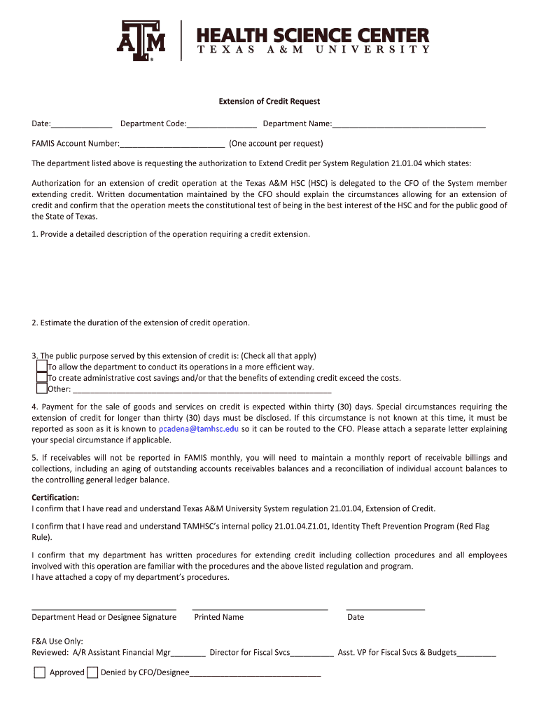 Get the free Extension of Credit Request - tamhsc