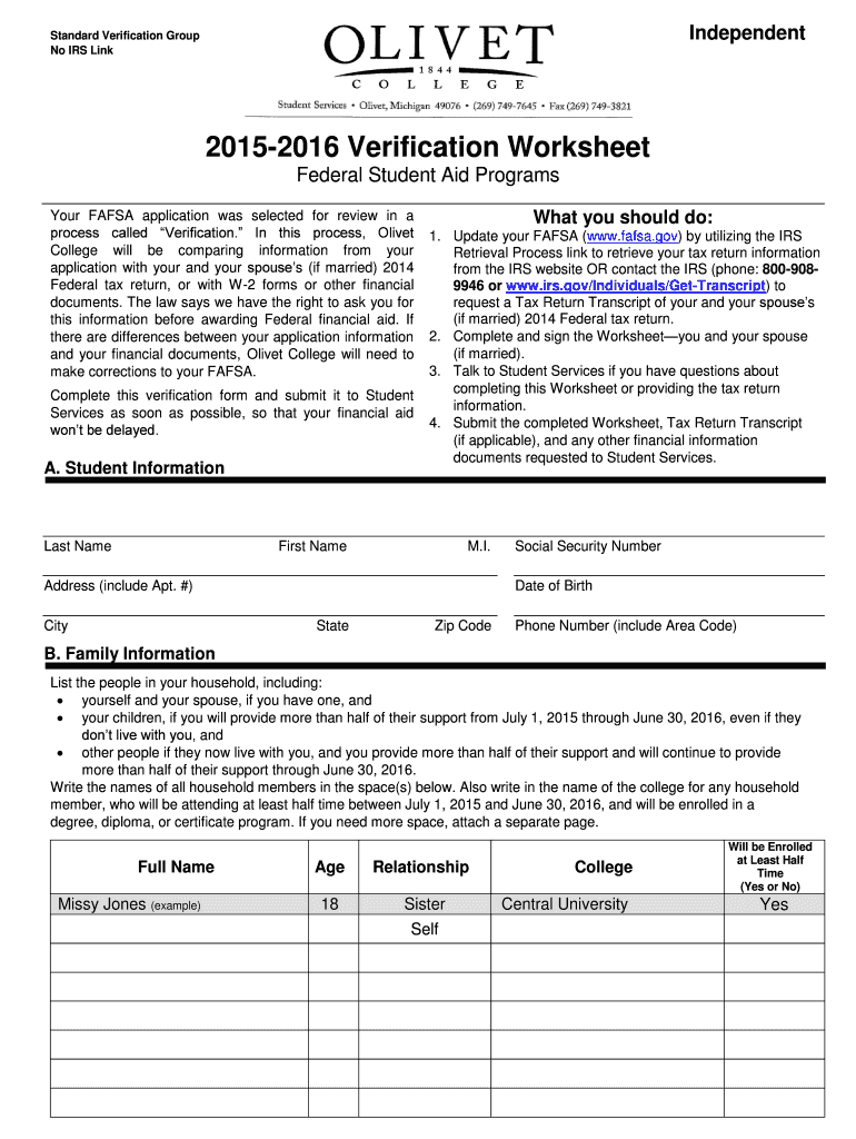 Independent Standard Verification Group No IRS Link 20152016 Verification Worksheet Federal Student Aid Programs Your FAFSA application was selected for review in a process called Verification. In