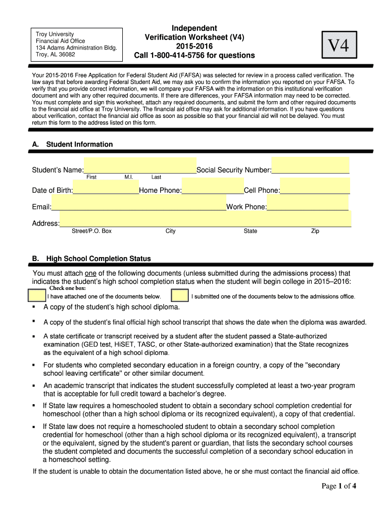 Save As Reset Form Print Independent Verification Worksheet (V4) 2015-2016 Call 1-800-414-5756 for questions Troy University Financial Aid Office 134 Adams Administration Bldg. Troy, AL 36082 V4 Your