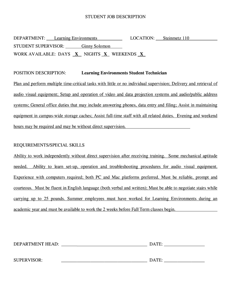 STUDENT JOB DESCRIPTION DEPARTMENT: Learning Environments STUDENT SUPERVISOR: WORK AVAILABLE: DAYS LOCATION: Steinmetz 110 Ginny Solomon X POSITION DESCRIPTION: NIGHTS X WEEKENDS X Learning Environments