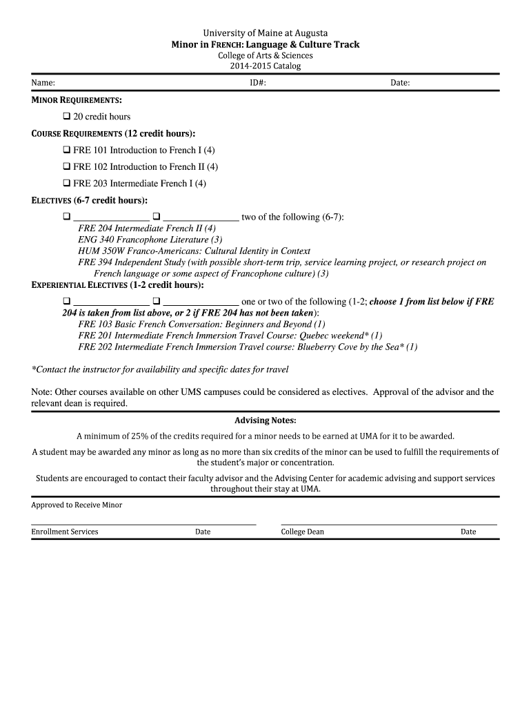 University of Maine at Augusta Minor in FRENCH: Language & Culture Track College of Arts & Sciences 20142015 Catalog Name: ID#: Date: MINOR REQUIREMENTS: 20 credit hours COURSE REQUIREMENTS (12 credit