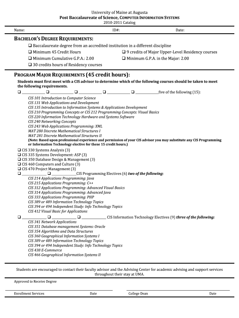 Name: University of Maine at Augusta Post Baccalaureate of Science, COMPUTER INFORMATION SYSTEMS 20102011 Catalog ID#: Date: Baccalaureate degree from an accredited institution in a different discipline