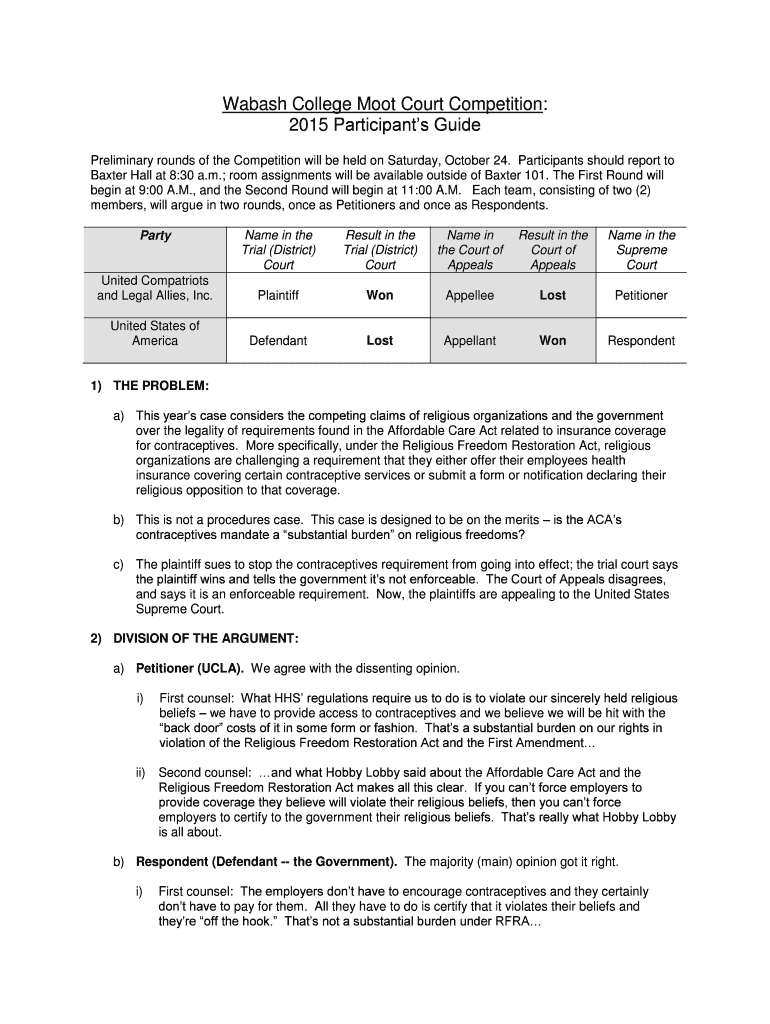 Wabash College Moot Court Competition: 2015 Participants Guide Preliminary rounds of the Competition will be held on Saturday, October 24. Participants should report to Baxter Hall at 8:30 a.m.; room