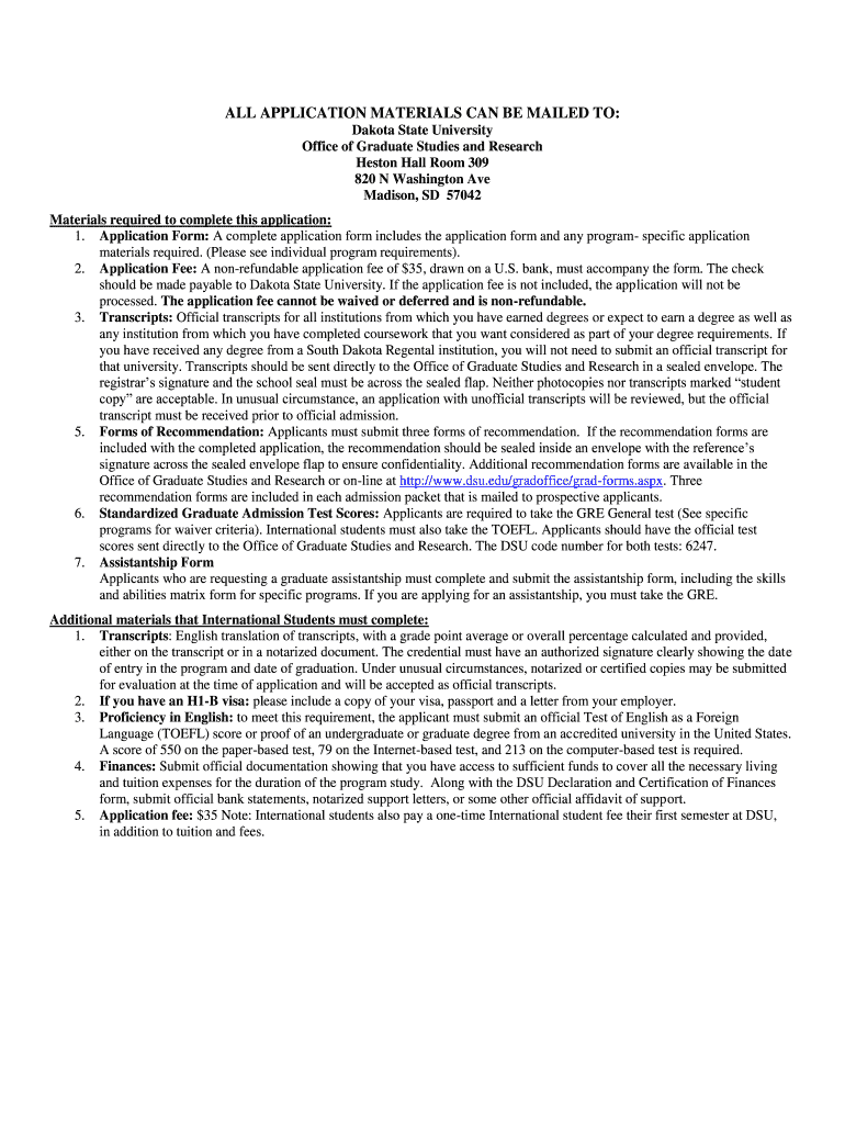 Application Form: A complete application form includes the application form and any ... http://dsu.edu/graduate-students/graduate-admissions/graduate- application. 5. ... Test Scores: Applicants are