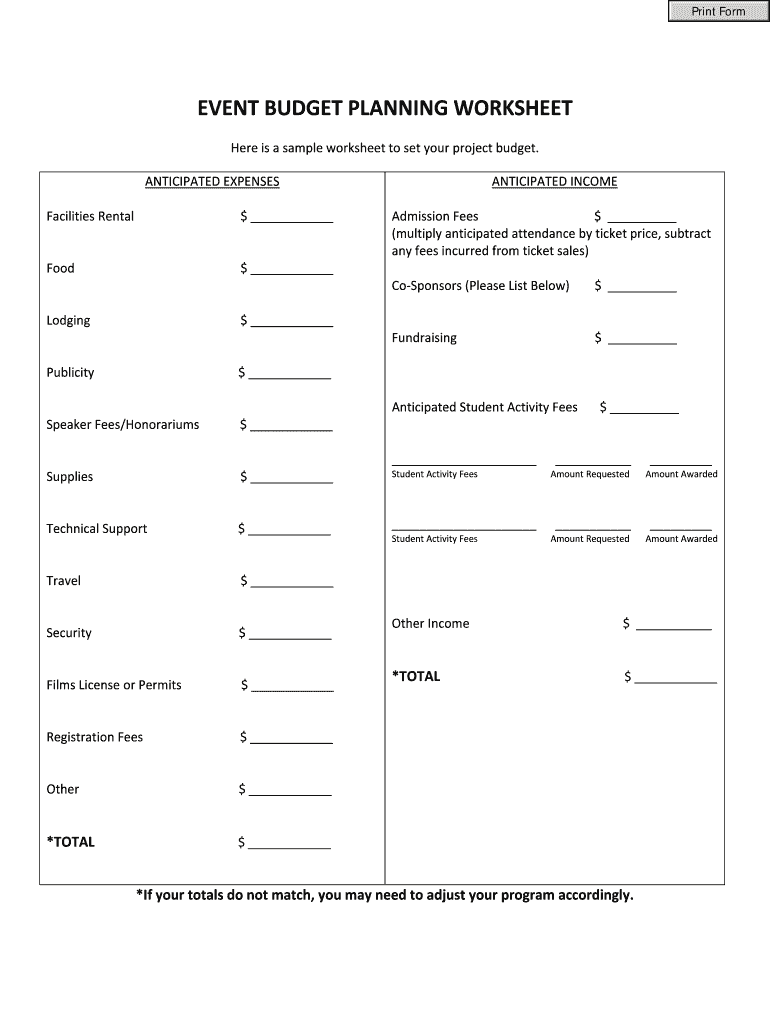 While specific deadlines may depend on your event, it is generally best to complete and submit the budget worksheet well in advance of your event date.