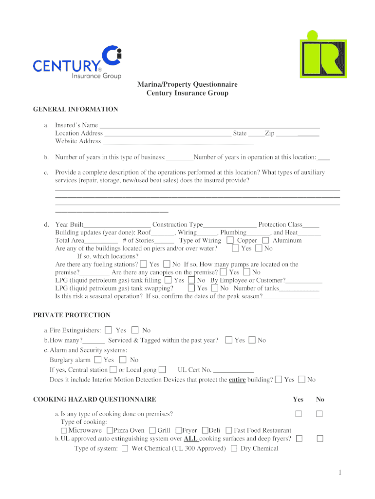 Email Form Print Form Marina/Property Questionnaire Century Insurance Group GENERAL INFORMATION a. Insureds Name Location Address Website Address State Zip b. Number of years in this type of business: