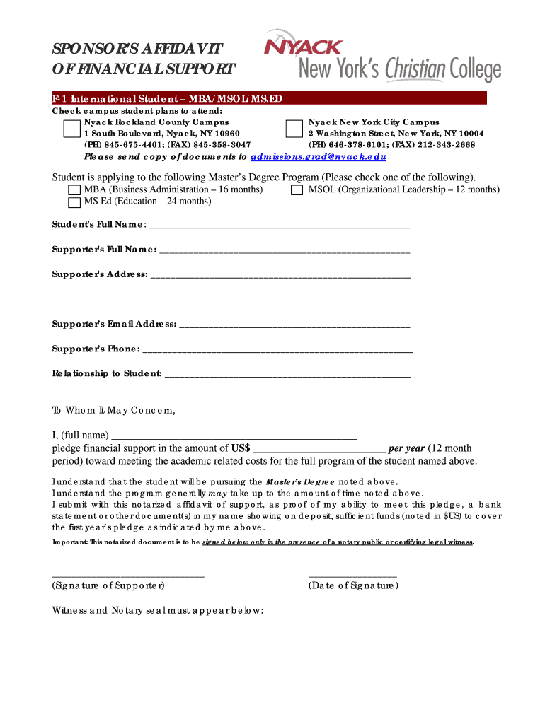SPONSOR IS AFFIDAVIT OF FINANCIAL SUPPORT F1 International Student MBA/SOL/MS.ED Check campus student plans to attend: Back Rockland County Campus 1 South Boulevard, Back, NY 10960 (PH) 8456754401;