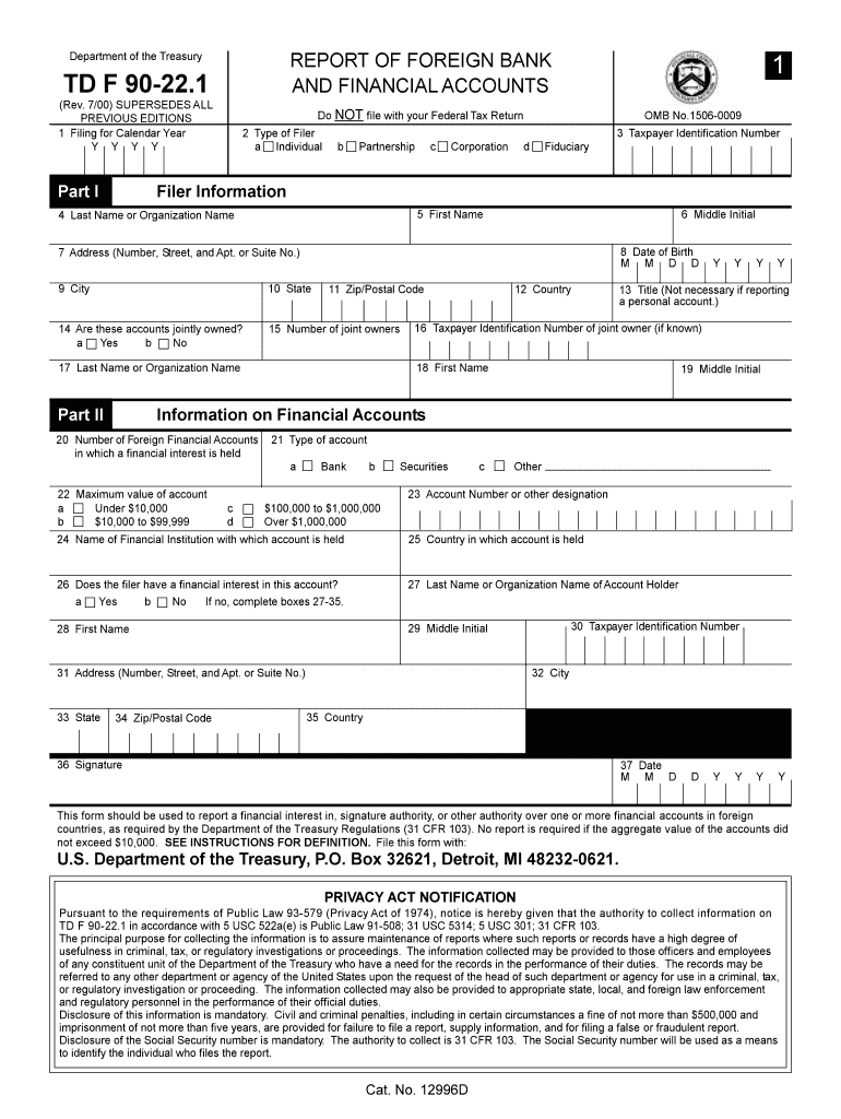 REPORT OF FOREIGN BANK AND FINANCIAL ACCOUNTS Department of the Treasury TD F 9022.1 (Rev. 7/00) SUPERSEDES ALL PREVIOUS EDITIONS 1 Filing for Calendar Year Y Y Y Y Part I 1 Do NOT file with your