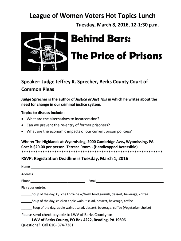 League of Women Voters Hot Topics Lunch Tuesday, March 8, 2016, 121:30 p.m. Behind Bars: The Price of Prisons Speaker: Judge Jeffrey K. Speeches, Berks County Court of Common Pleas Judge Speeches