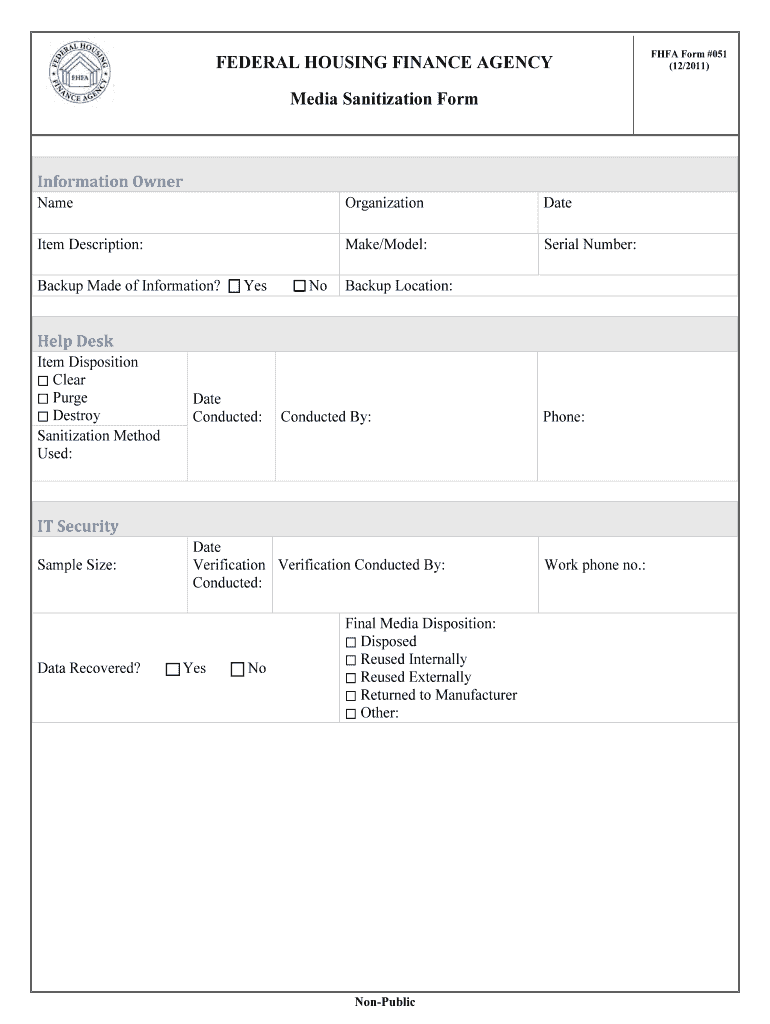 FEDERAL HOUSING FINANCE AGENCY Media Sanitization Form Information Owner Name Organization Date Item Description: Make/Model: Serial Number: Backup Made of Information? Yes No Backup Location: Help