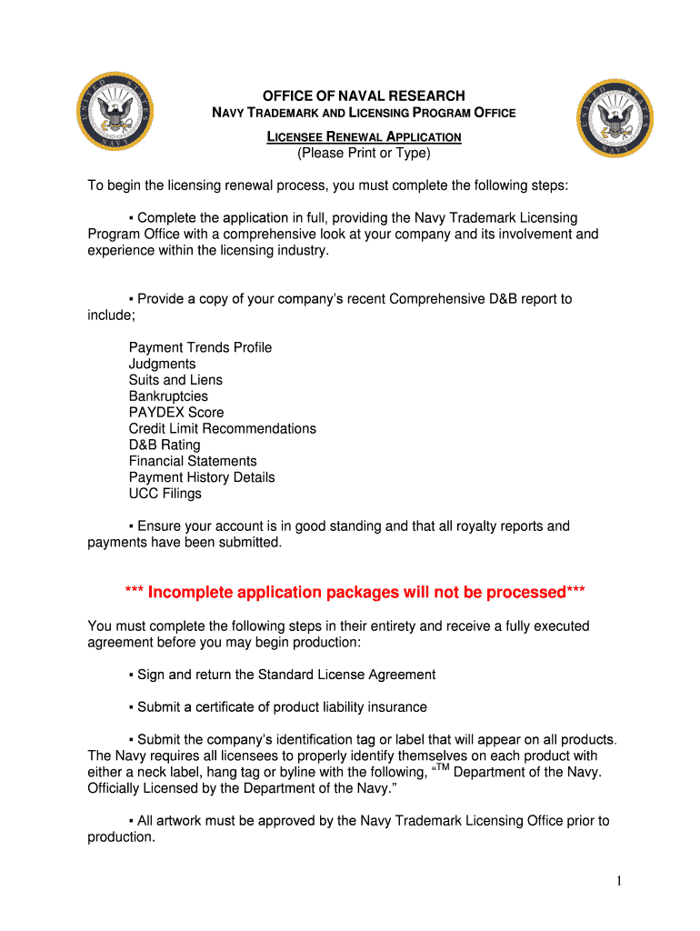 OFFICE OF NAVAL RESEARCH NAVY TRADEMARK AND LICENSING PROGRAM OFFICE LICENSEE RENEWAL APPLICATION (Please Print or Type) To begin the licensing renewal process, you must complete the following steps: