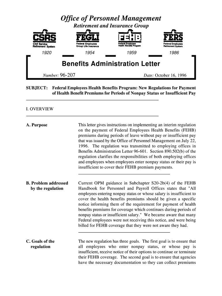 SUBJECT:Date: October 16, 1996Federal Employees Health Benefits Program: New